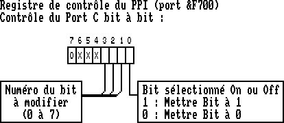 Alors, le PPI possède 3 ports de 8 bits chacun plus un registre de contrôle du mode de fonctionnement de ces ports. Ces ports sont situés aux adresses &F4xx, &F5xx et &F6xx, ils sont appelés respectivement port A, B et C. Le registre de contrôle est placé en &F7xx. Ce dernier sert à définir, pour chaque port, s'il est en entrée ou en sortie, ainsi que son mode de travail. Le port C a la particularité de pouvoir se scinder en deux moitiés, c'est-à-dire que l'on peut mettre ses bits 0 à 3 en sortie et ses bit 4 à 7 en entrée simultanément et vice versa.