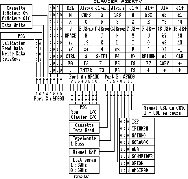 En effet, General Instrument avait développé le PSG pour l'inclure dans des petits jeux électroniques ce qui explique qu'il gère un petit clavier… Et ce qui explique que l'on ait besoin de 4 bits supplémentaires pour définir les touches sur CPC !