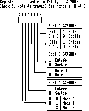 Alors, le PPI possède 3 ports de 8 bits chacun plus un registre de contrôle du mode de fonctionnement de ces ports. Ces ports sont situés aux adresses &F4xx, &F5xx et &F6xx, ils sont appelés respectivement port A, B et C. Le registre de contrôle est placé en &F7xx. Ce dernier sert à définir, pour chaque port, s'il est en entrée ou en sortie, ainsi que son mode de travail. Le port C a la particularité de pouvoir se scinder en deux moitiés, c'est-à-dire que l'on peut mettre ses bits 0 à 3 en sortie et ses bit 4 à 7 en entrée simultanément et vice versa.