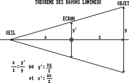 Comme vous savez maintenant calculer les translations et les rotations, il ne vous reste plus qu'à projeter les points 3D sur l'écran. En fait, tout réside dans le théorème des rayons lumineux (vous voyez que ça sert parfois la physique !). Bon, comme ce n'est pas très compliqué, je vais vous filer le schéma ainsi que les formules qui permettent la projection :