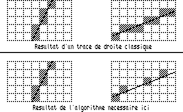 La calcul des abscisses est fait par un dérivé de l'algorithme de Bresenham que je vous ai déjà décrit précedemment. Ceci oblige à parcourir tous les points de la droite (le WHILE…WEND est indispensable). On peut donc préférer un algorithme qui se sert directement de l'équation de la droite, mais il faut alors se méfier des erreurs d'arrondi.