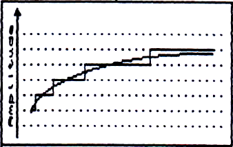 La première dégradation du son par l'échantillonnage est donc une discrétisation de l'amplitude. C'est ce que vous montre vaguement la figure 3, les lignes horizontales en pointillés montrent les valeurs possibles du signal échantillonné (la fonction en escaliers) alors que le signal continu est celui de départ.